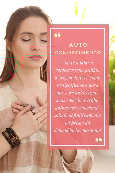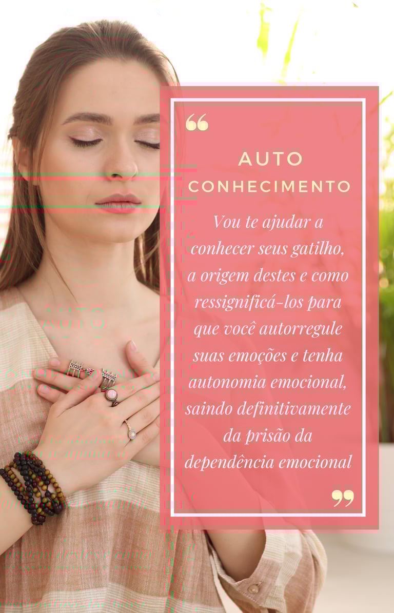 Vou te ajudar a conhecer seus gatilhos, a origem destes e como ressignificá-los para que você autorregule suas emoções e tenha autonomia emocional, saindo definitivamente da prisão da dependência emocional.