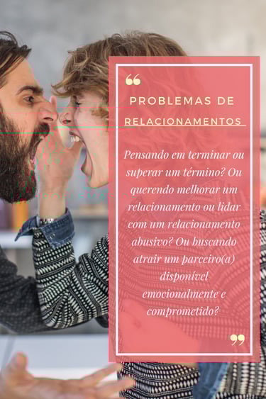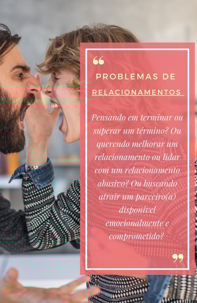 Pensando em terminar ou superar um término? Ou querendo melhorar um relacionamento ou lidar com um relacionamento abusivo? Ou buscando atrair um parceiro(a) disponível emocionalmente e comprometido? Vou te ajudar a resgatar seu poder feminino, melhorar sua autoestima e comunicação para você manifestar um relacionamento saudável.