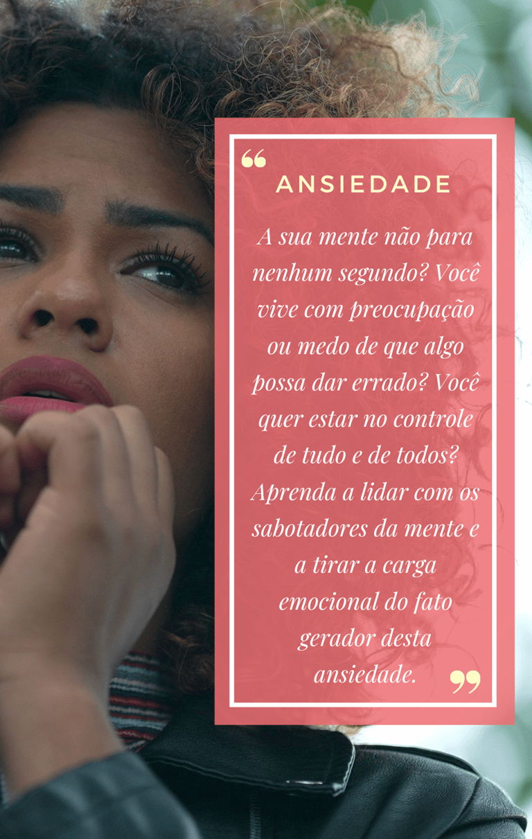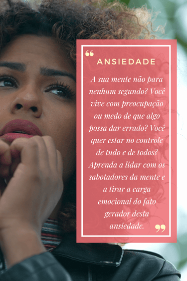 A sua mente não para nenhum segundo? Você vive com preocupação ou medo de que algo possa dar errado? Você quer estar no controle de tudo e de todos? Aprenda a lidar com os sabotadores da mente e a tirar a carga emocional do fato gerador desta ansiedade para que você possa viver mais no momento presente de forma tranquila e saudável.